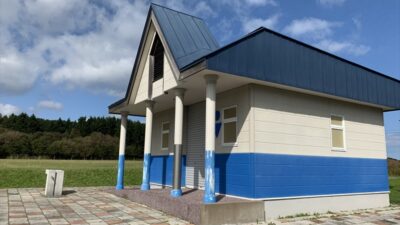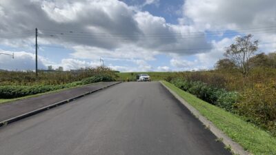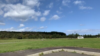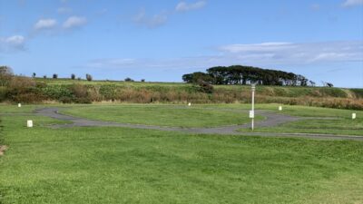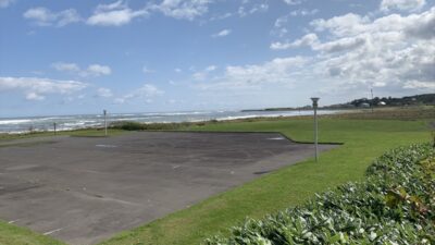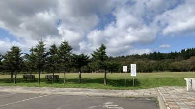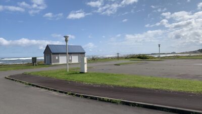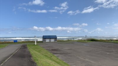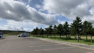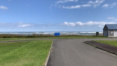枝幸町の道の駅(マリーンアイランド岡島)の裏にあるキャンプ場、夏場は全国から長期滞在するキャンピングカーが集結 オホーツクで海水浴も楽しめる